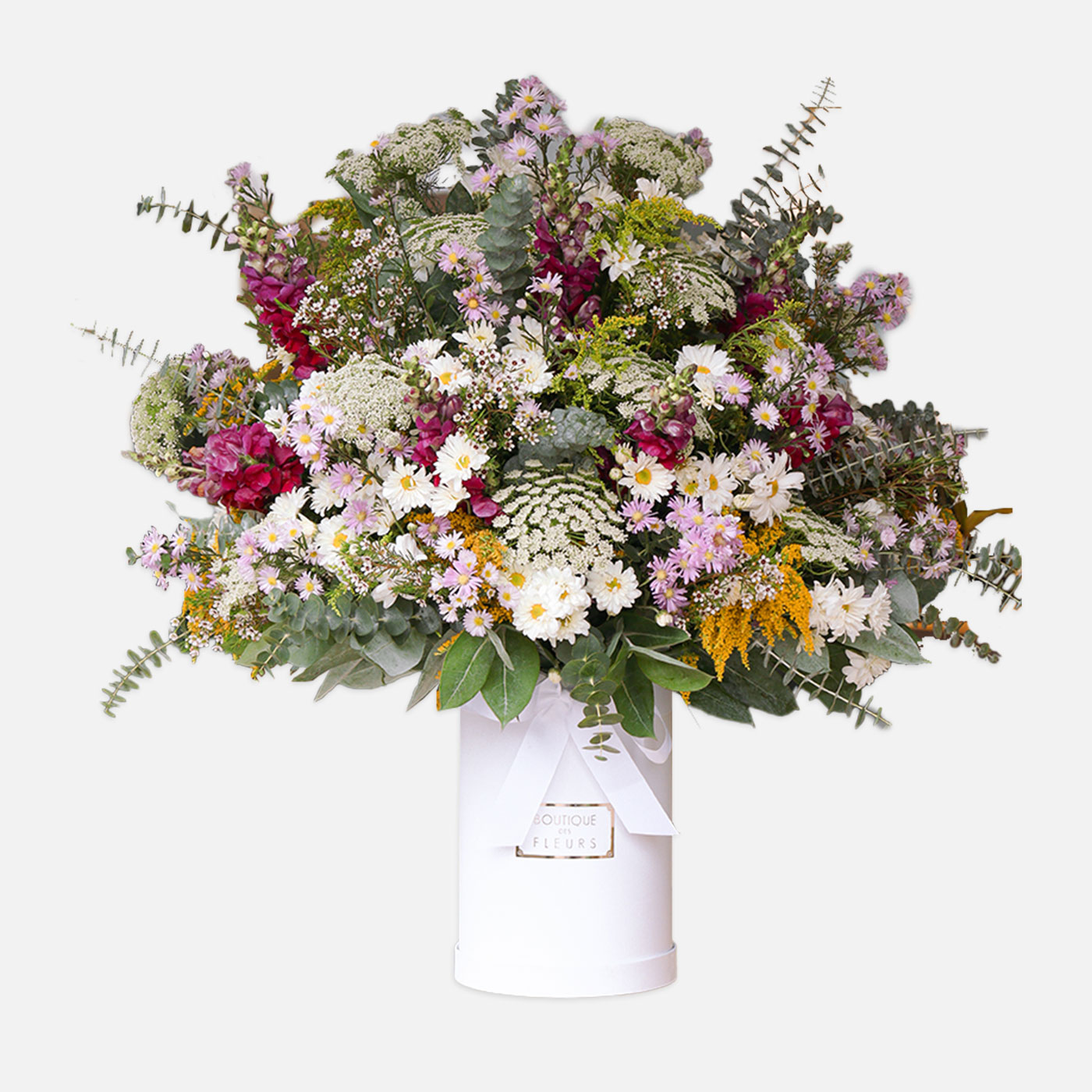 Mix de flores especial en caja pequeña con flores en tonos pasteles.
